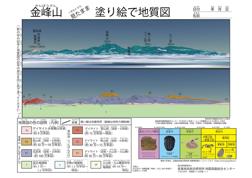 トップ 遊んで学ぼう!地質 塗り絵 金峰山 ( きんぼうざん ) くまもとから見たまま 塗 ( ぬ ) り 絵 ( え ) で地質図 金峰山 ( きんぼうざん ) くまもとから見たまま 塗 ( ぬ ) り 絵 ( え ) で 地質 ( ちしつ ) 図 熊本市(くまもとし)のシンボルの金峰山(きんぼうざん)を東側(ひがしがわ)にある熊本県庁(くまもとけんちょう)付近(ふきん)の高(こう)い階(かい)にあたるところから見(み)みた風景(ふうけい)です。有明海(ありあけかい)を挟(はさ)んだ雲仙岳(うんぜんだけ)も見(み)えています。 好(す)きな9種類(きゅうしゅるい)の色(いろ)を決(き)めて塗(ぬ)り分(ぶん)わけてみましょう。 山(やま)の絵(え)の中(なか)なかに書(か)かかれた文字(もじ)と左下(ひだりした)の枠(わく)の中(なか)の同(おな)じ文字(もじ)のある部分(ぶぶん)は同(おな)じ色(いろ)で塗(ぬ)ります。できた年代(ねんだい)の古(ふる)いものから塗(ぬ)っていくと山(やま)のでき方(かた)がわかりやすくなります。 ダウンロードする (pdf:1.2MB) 塗(ぬ)り方(かた)の参考(さんこう)例(れい)
