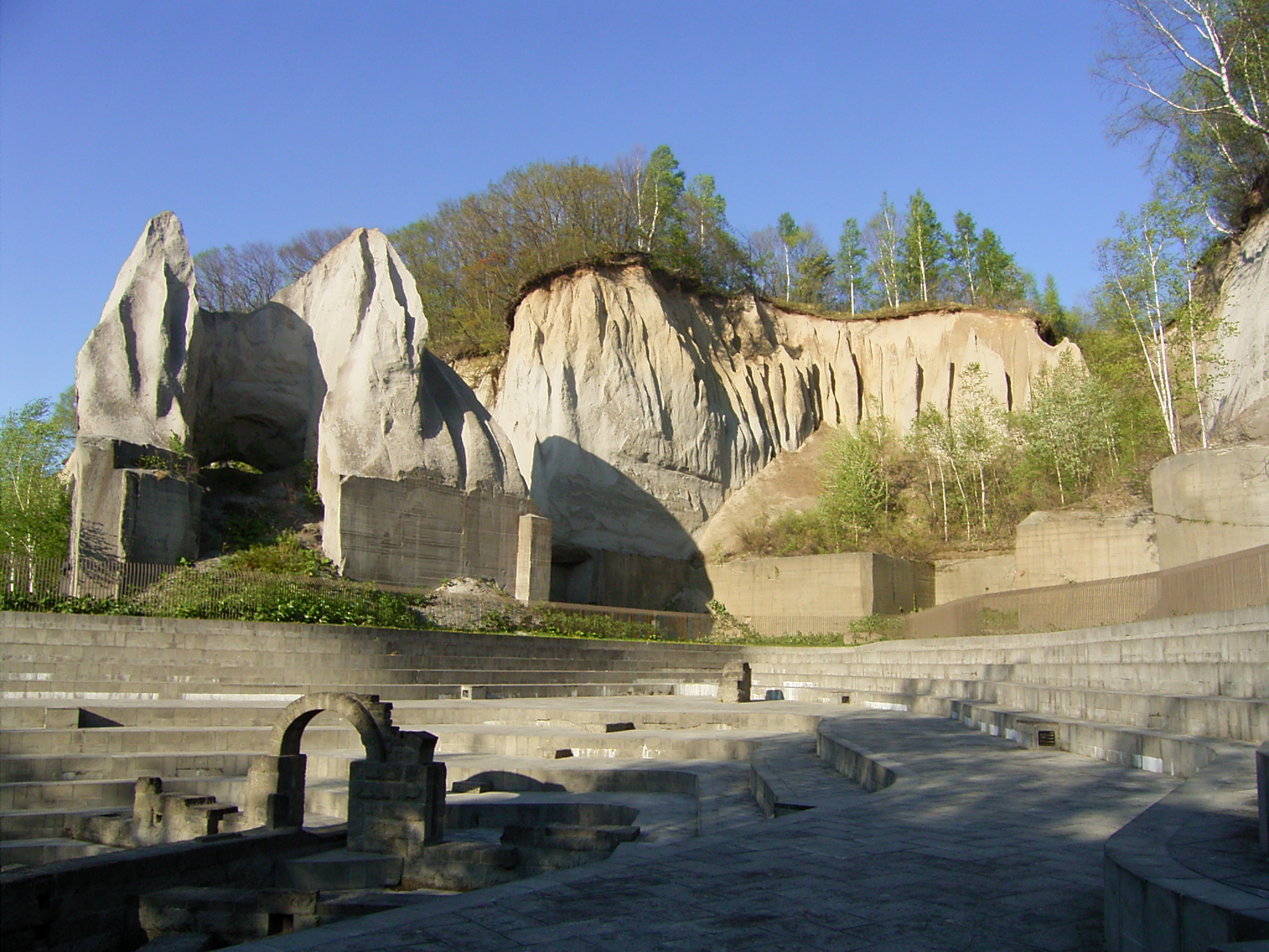 札幌市南区には石切場の跡が随所に残っています。ここで採れる石材「札幌軟石」は、 支笏カルデラから約4万年前に噴出した火山灰が固まった溶結凝灰岩です。火山灰は 高温のガスと混じった火砕流として流れ、自分の熱で融けて固まりました。火山灰層 の下側はよく固まっているので石材として使われましたが、上側は柔らかく、石切が 終わった今では侵食に身をまかせています。