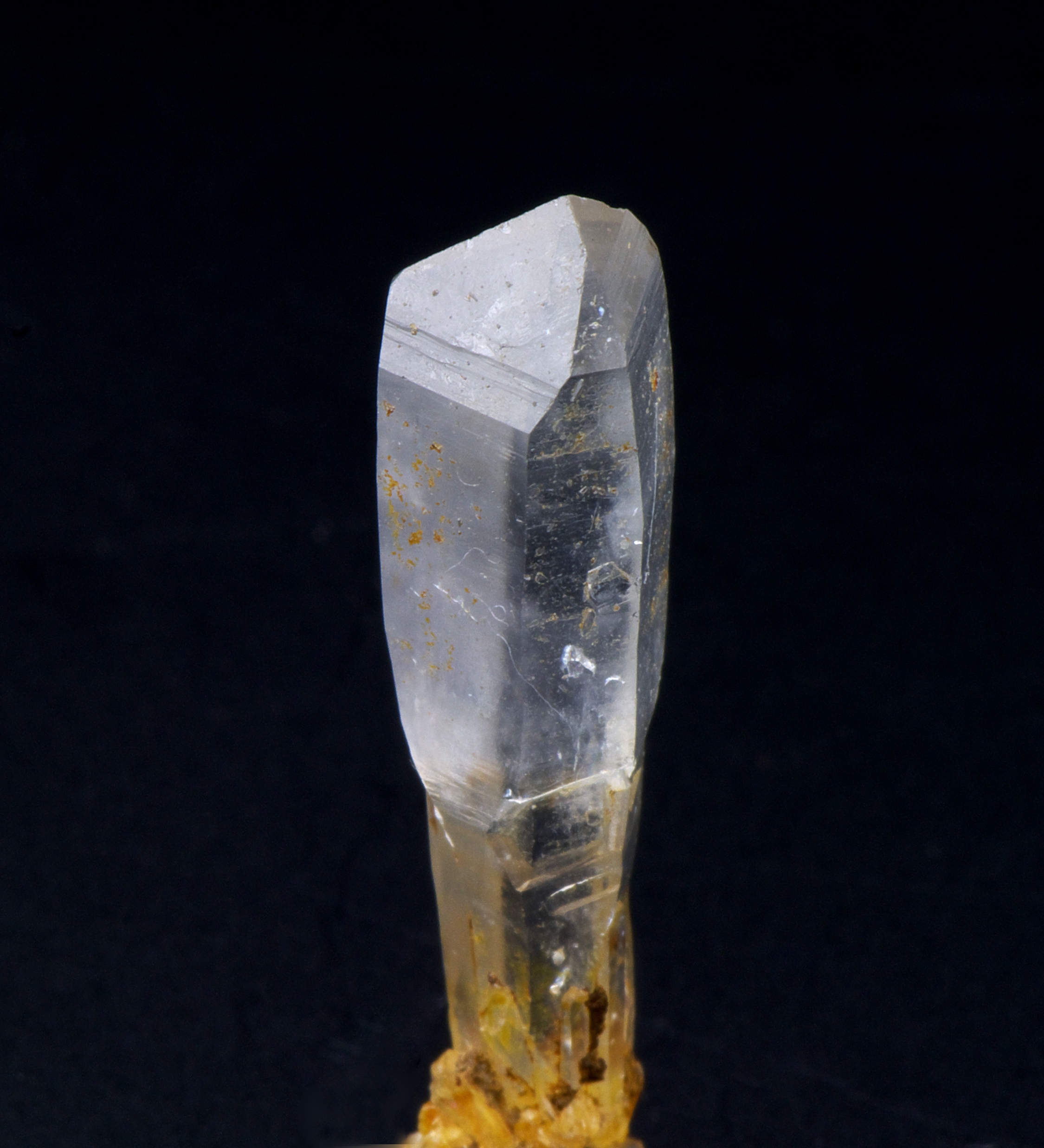細長い水晶の上を、僅かに太い水晶が覆った二階建てになっています。 このような水晶を"松茸水晶"とよぶならわしがありますが、松茸の笠に 相当する部分がスリムになると土筆に似てきます。"土筆水晶"という言葉 があると便利だと思いました。珍しい形なのでお気に入りの一品です。 光の角度によって、一階部分の褐色が美しく際だちます。